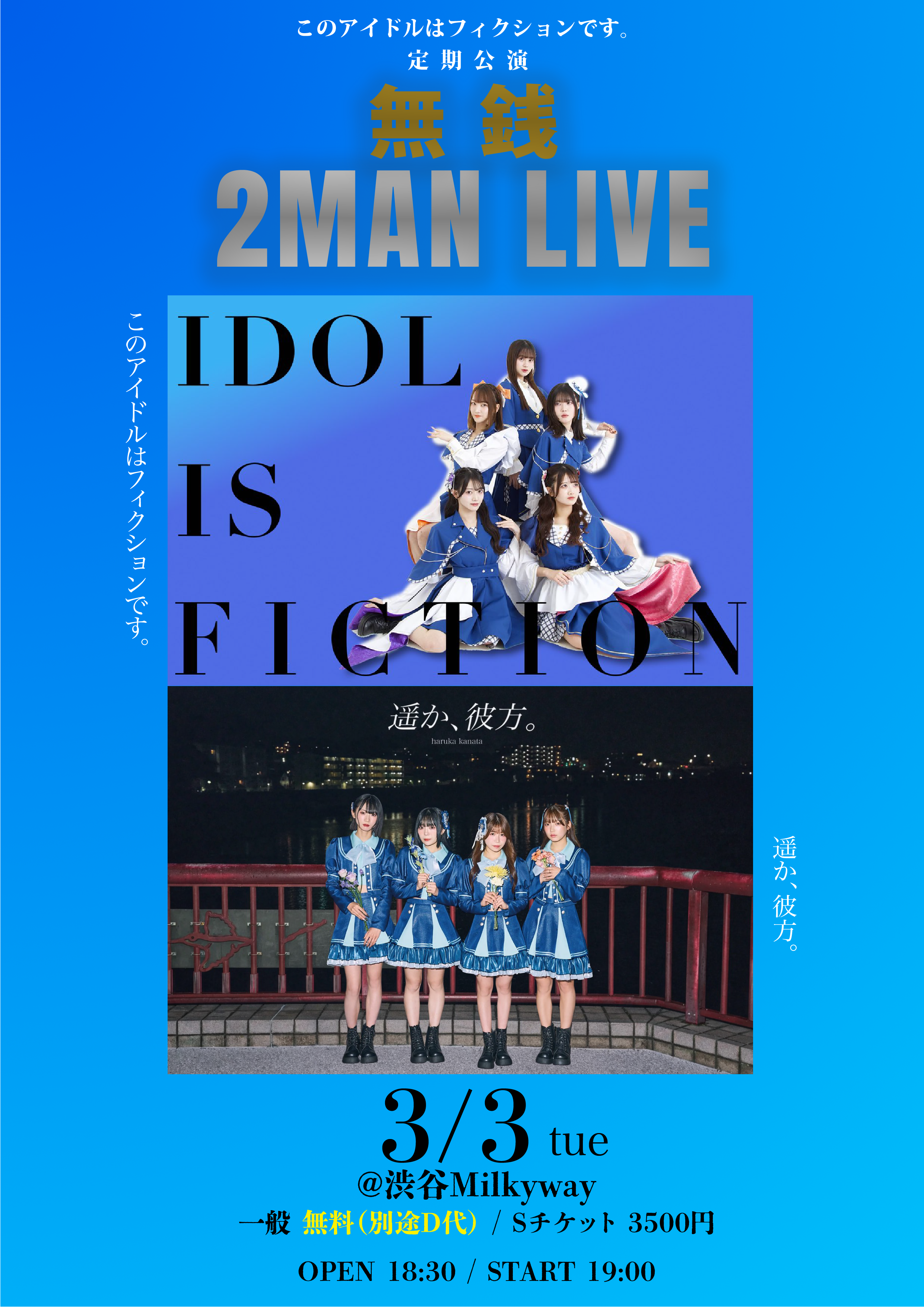 2026-03-03[tue.] このアイドルはフィクションです。x 遥か、彼方。 2MAN LIVE OPEN / START18:30 19:00 ADV / DAY / ¥500 (+1D ORDER) ・Sチケット : ¥3,500(前方エリアあり) ・一般チケット : ¥0 《入場無料》(別途D代) 当日券各種 +¥500(別途D代) CAST