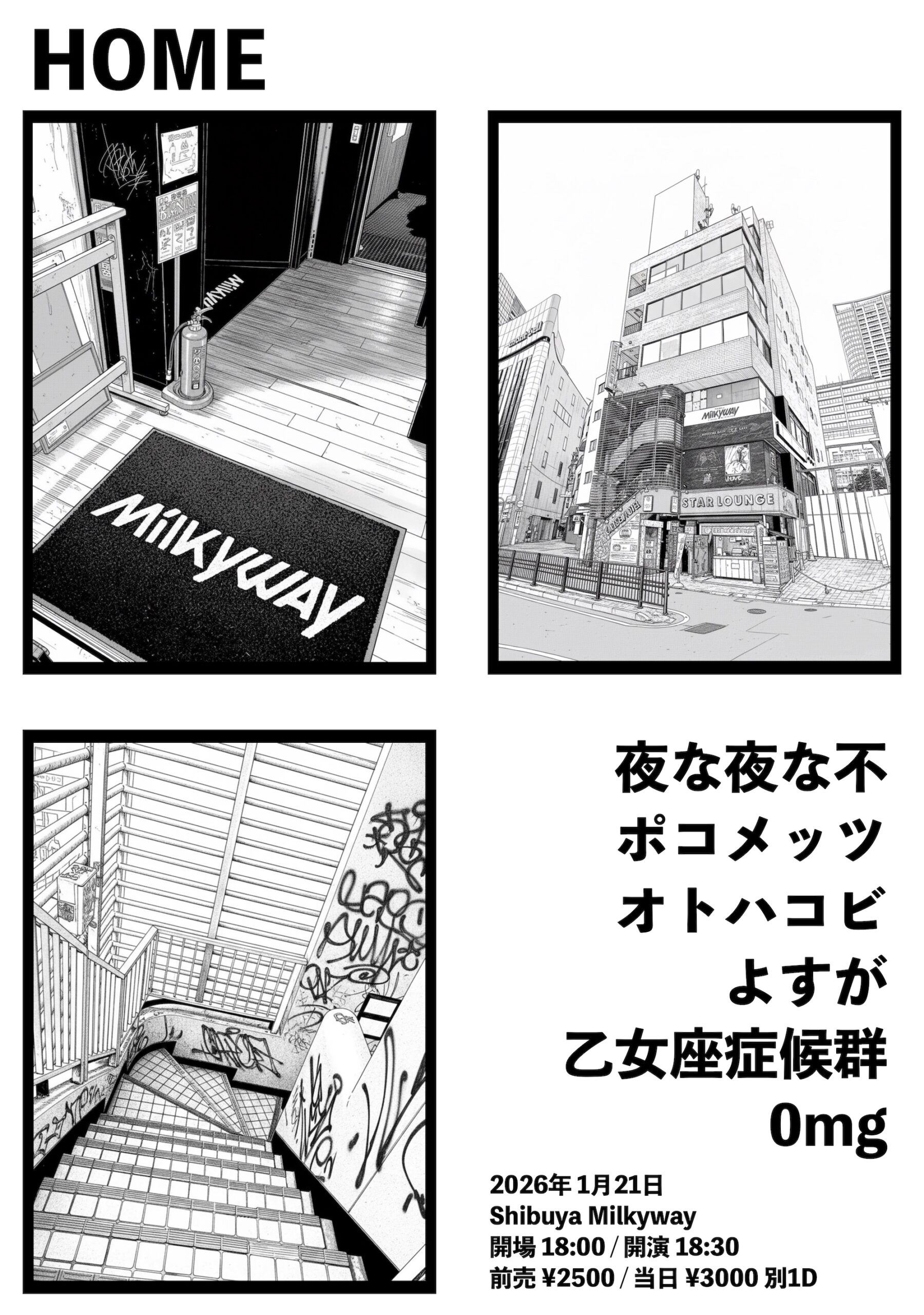 2026-01-21[wed.] HOME OPEN / START18:00 18:30 ADV / DAY ¥2,500 / ¥3,000 (+1D ORDER) CAST 夜な夜な不 ポコメッツ よすが オトハコビ 乙女座症候群 0mg