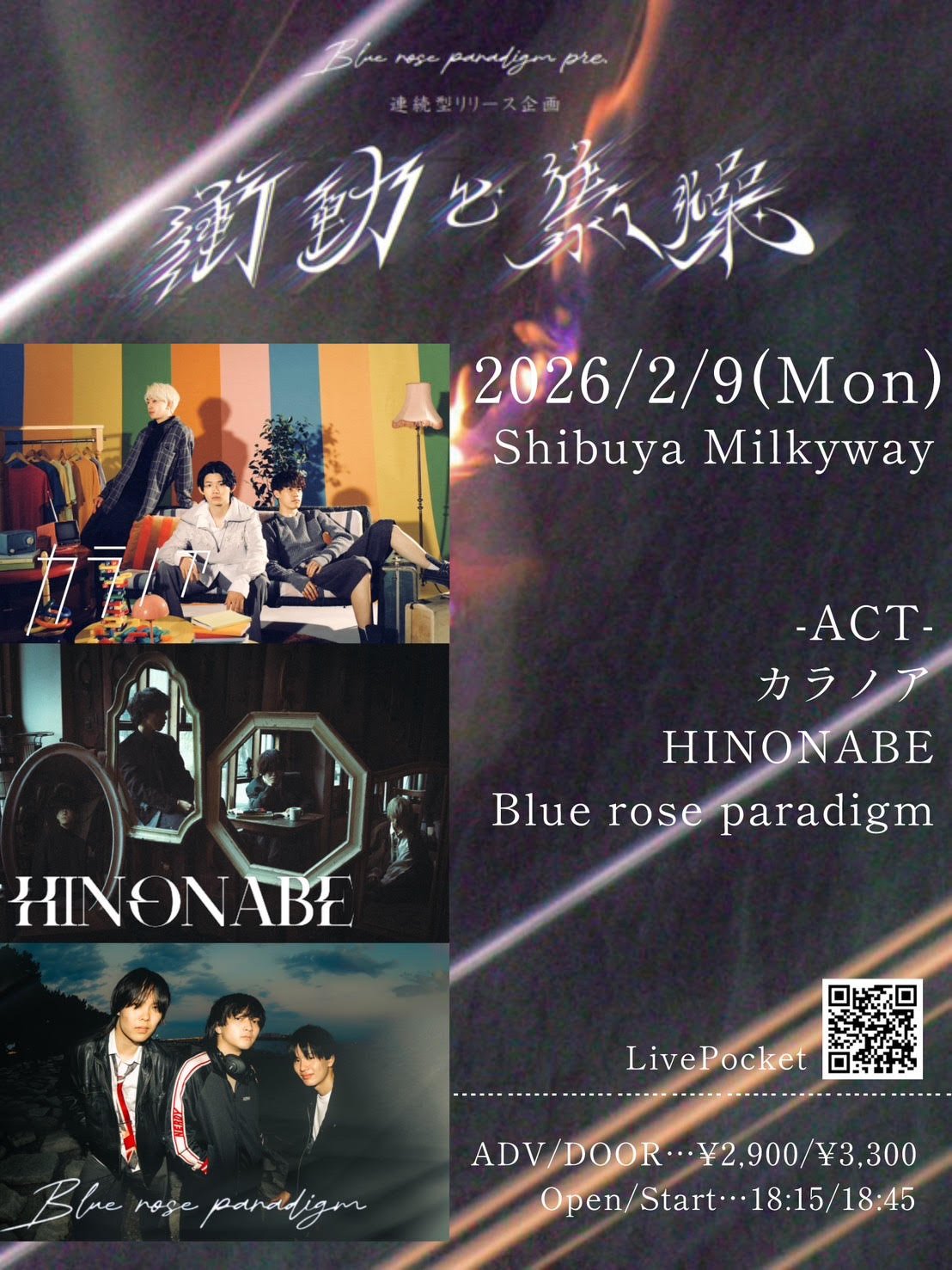 2026-02-09[mon.] Blue rose paradigm presents. 連続型リリース企画Vol2 『衝動と焦燥』-黎明編- OPEN / START18:15 18:45 ADV / DAY ¥2,900 / ¥3,300 (+1D ORDER) CAST Blue rose paradigm HINONABE カラノア