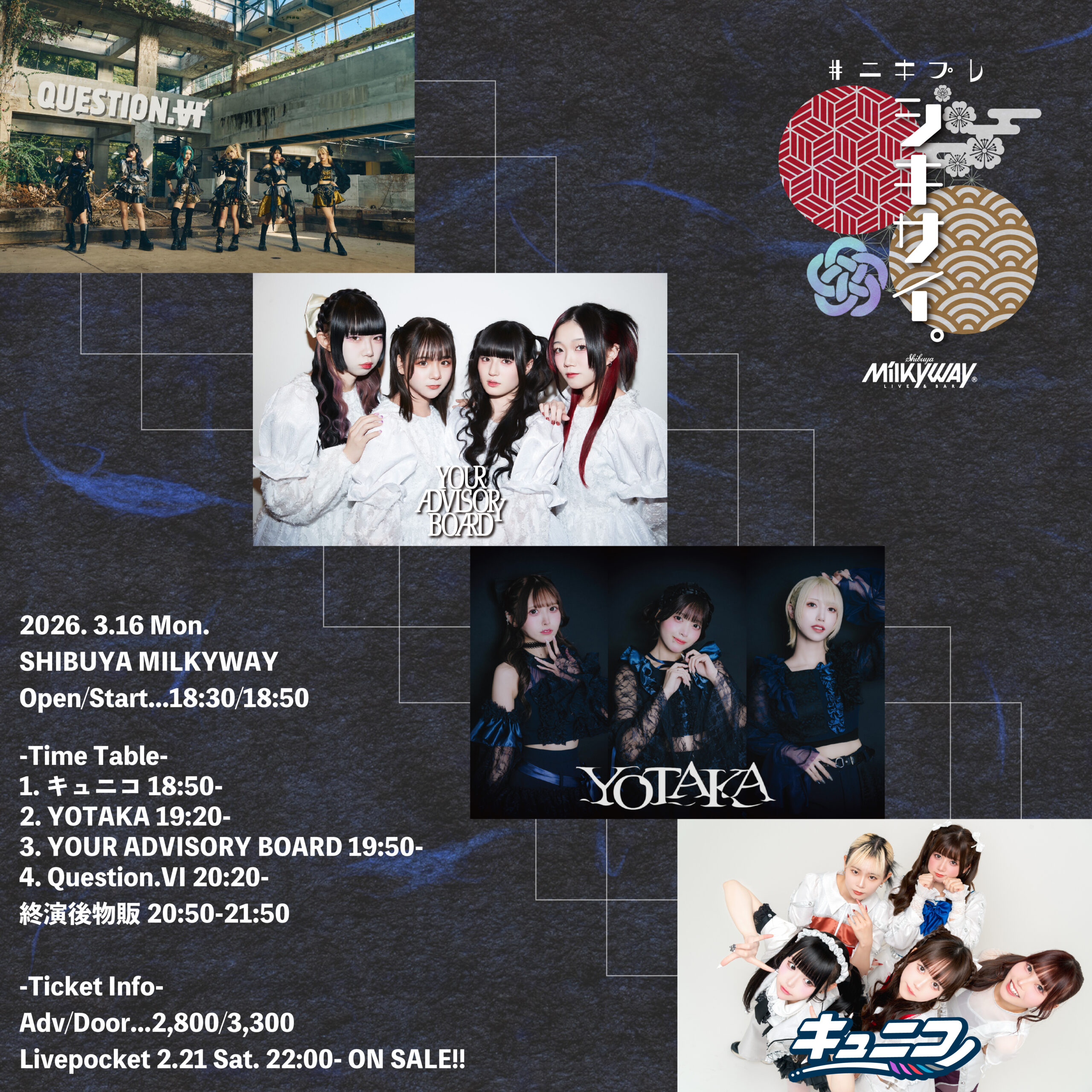 2026-03-16[mon.] #ニキプレ『シキサイ。』 OPEN / START18:30 18:50 ADV / DAY ¥2,800 / ¥3,300 (+1D ORDER) CAST Question.VI YOUR ADVISORY BOARD YOTAKA キュニコ
