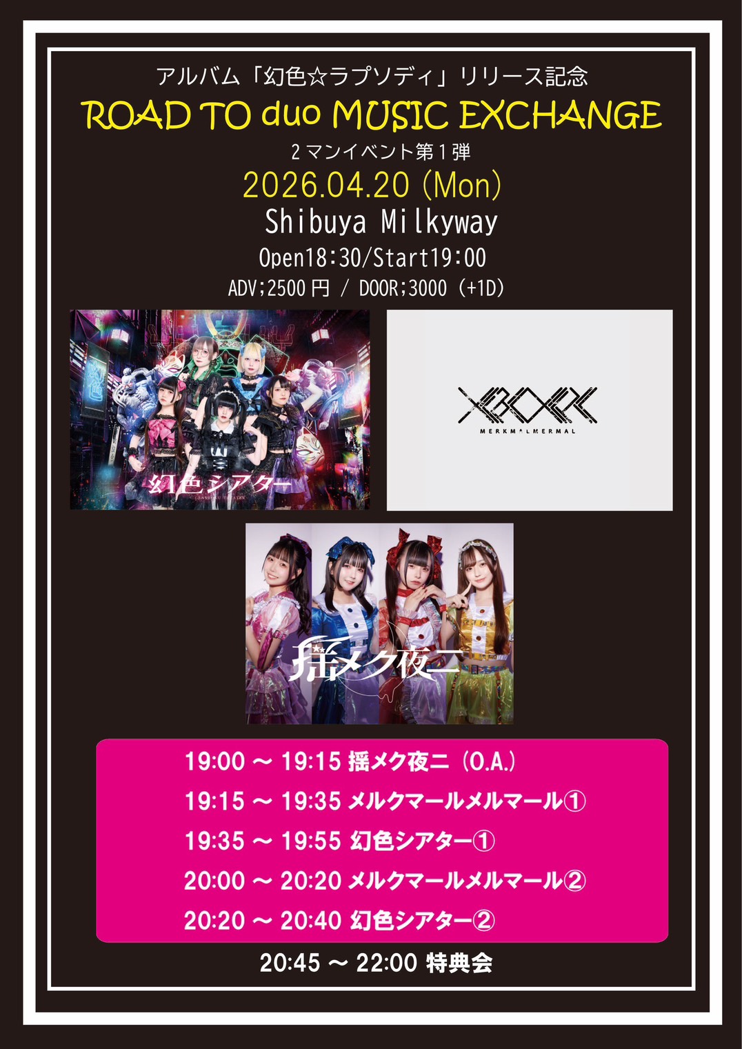 2026-04-20[mon.] アルバム「幻色☆ラプソディ」リリース記念 ROAD TO duo MUSIC EXCHANGE OPEN / START18:30 19:00 ADV / DAY ¥2,500 / ¥3,000 (+1D ORDER) CAST 幻色シアター メルクマールメルマーる 揺メク夜ニ(O.A)